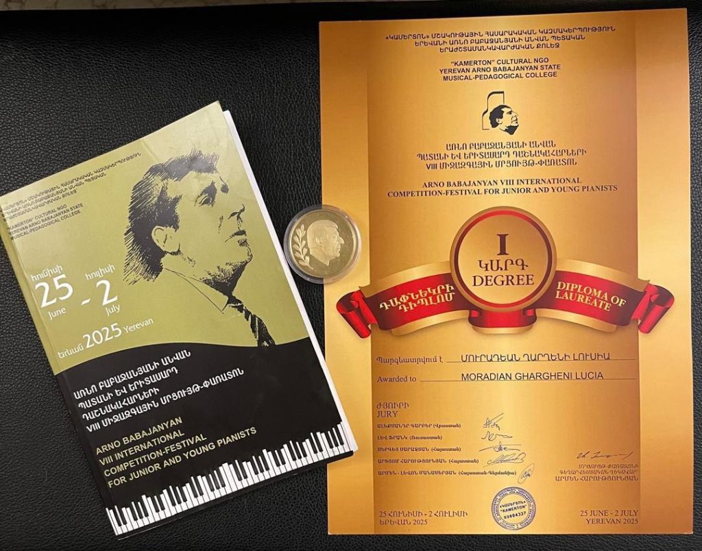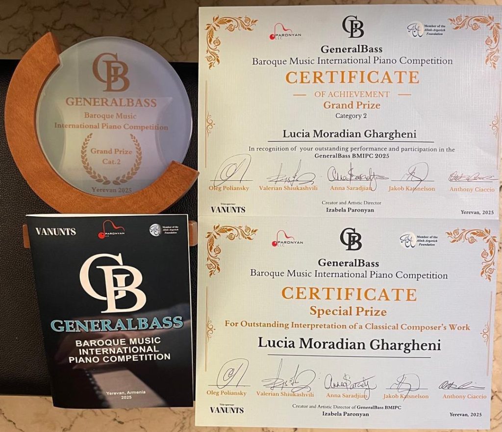 در تیر ماه ۱۴۰۴ خانم لوسیا مرادیان، در هشتمین دوره از «کنکور بین المللی پیانو آرنو باباجانیان» در گروه سنی ۱۲-۱۵ سال برنده مقام اول و مدال طلای مسابقات شده است و پس از آن در «کنکور بین المللی موسیقی باروک Generalbass 2025»، در category B برنده مقام Grand Prix و تندیس بلورین مسابقات شده و همچنین جایزه ویژه با عنوان برترین اجرای اثر از آهنگساز دوره کلاسیک را دریافت کرده است. شایان ذکر است هر دو مسابقه در پایتخت کشور ارمنستان شهر ایروان برگزار شدند.
